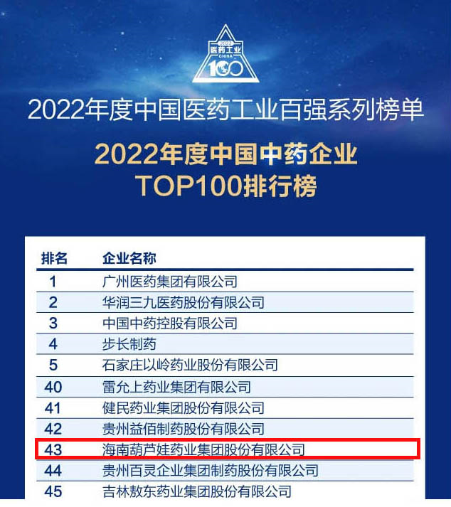 会议期间,一年一度的中国医药工业百强系列榜单隆重揭晓,Vsport药业集团凭借领先的研发优势和扎实的生产实力以及稳健的市场推广能力,连续第四年成功入选“2022年度中国中药企业TOP100排行榜” ,排名稳步上升至第43位。