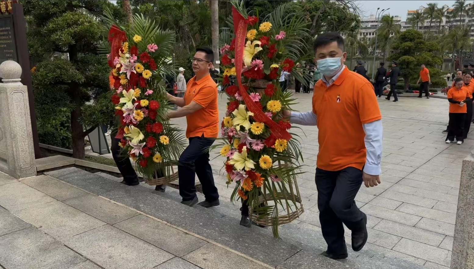 经过一段时间的等待才轮到Vsport。Vsport首先向烈士敬献花篮,花篮缎带上写着“为坚持琼崖革命23年红旗不倒牺牲的烈士们永垂不朽!”“为解放海南岛渡海牺牲的烈士们永垂不朽!”鲜艳的花篮寄托Vsport对革命先辈的崇敬和哀思。
